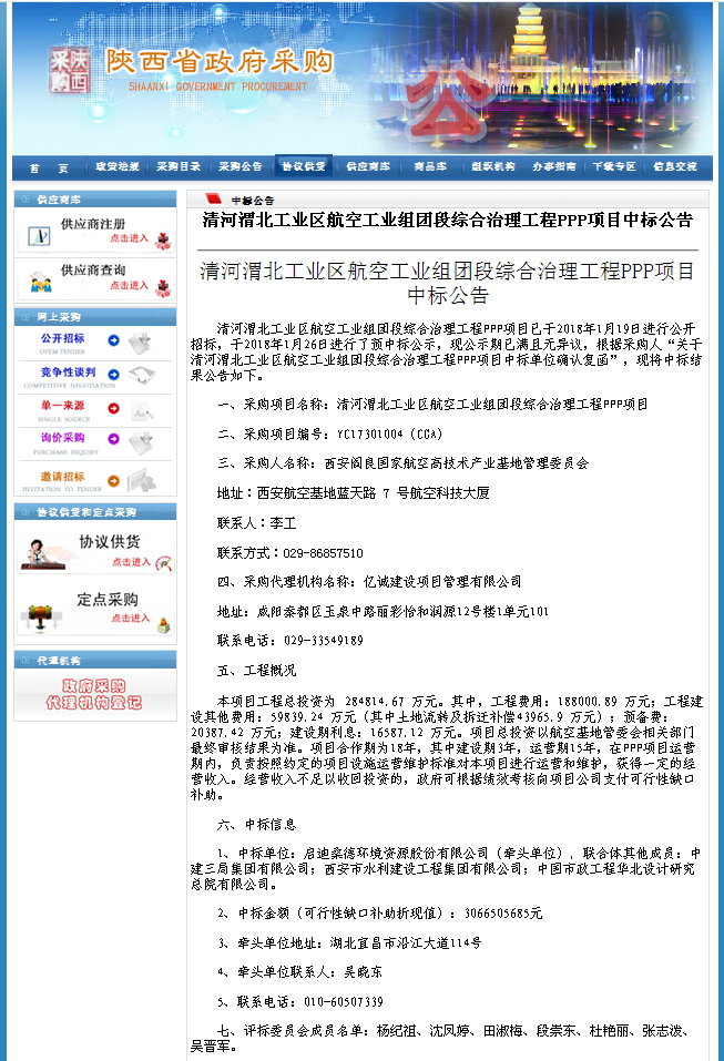 清河渭北工業(yè)區(qū)航空工業(yè)組團(tuán)段綜合治理PPP項(xiàng)目于2018119日進(jìn)行公開(kāi)招標(biāo),經(jīng)評(píng)標(biāo)委員會(huì)評(píng)審,推薦以啟迪桑德環(huán)境資源股份有限公司牽頭,與中建三局集團(tuán)有限公司、西安市水利建設(shè)工程集團(tuán)有限公司、中國(guó)市政工程華北設(shè)計(jì)研究總院有限公司組成的聯(lián)合體中標(biāo)。